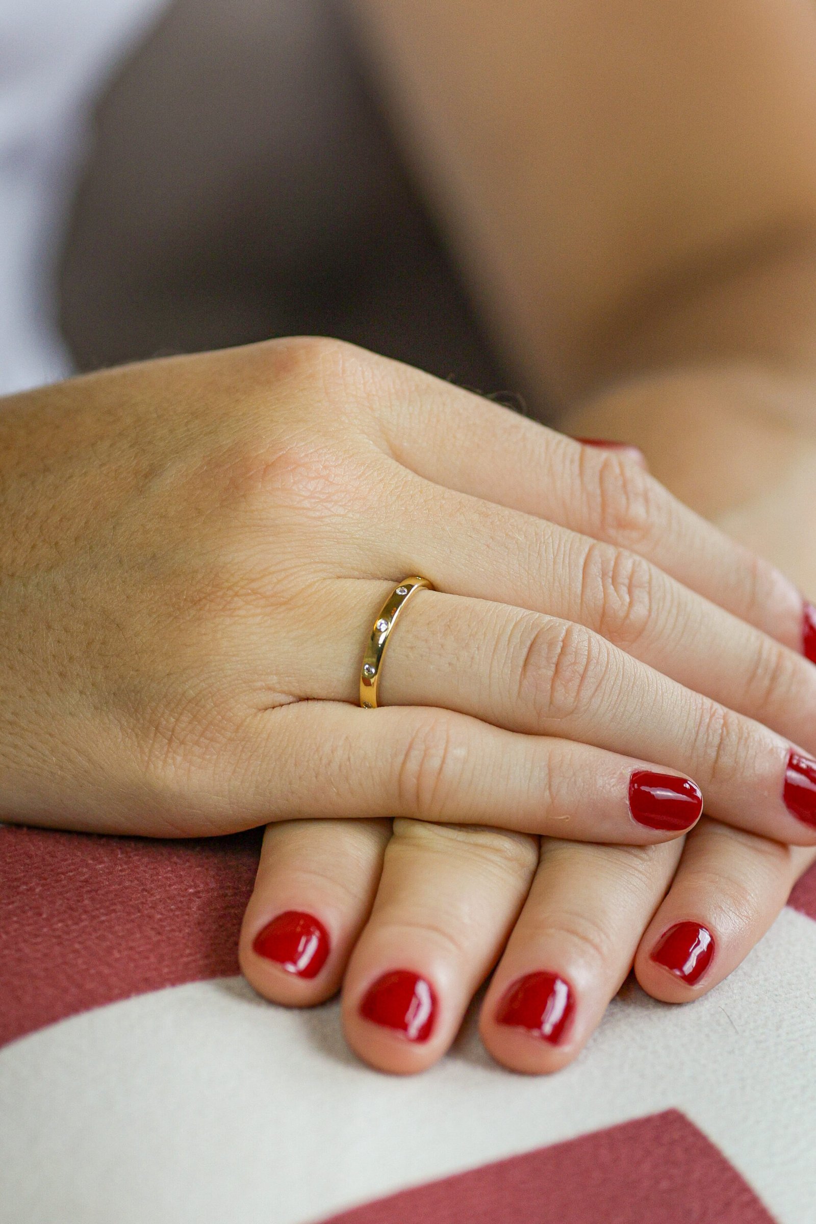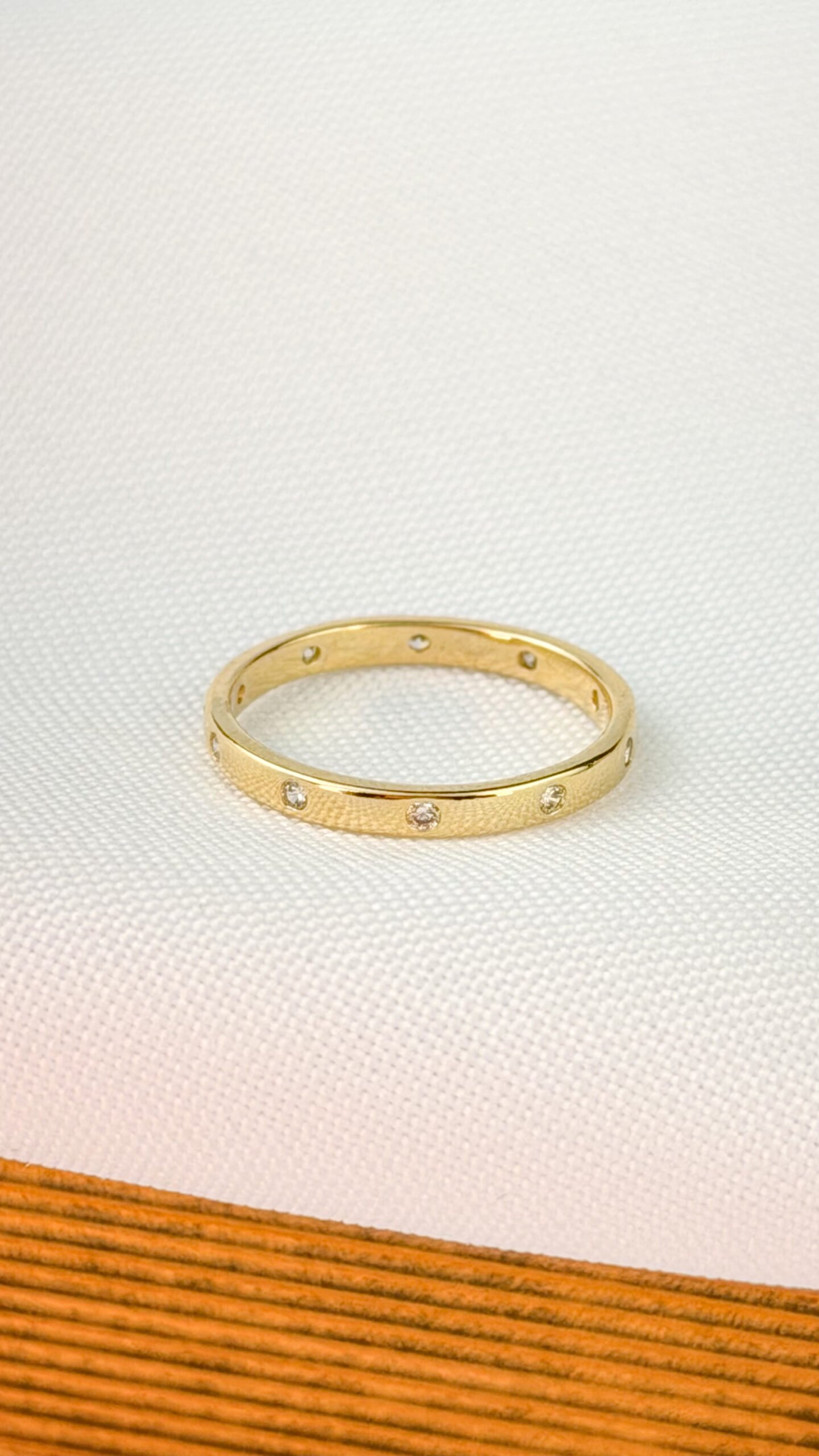 Anel em banho ouro 18k com design minimalista, composto por zircônias cravadas de forma discreta ao longo da peça, criando pontos sutis de brilho e sofisticação. Um modelo elegante e versátil, ideal para quem prefere joias delicadas para o dia a dia, sem abrir mão do charme. Pode ser usado sozinho para um visual clean ou combinado com outros anéis para composições modernas e refinadas. Tamanho 15. Peça hipoalergênica, proporcionando mais segurança para a pele.