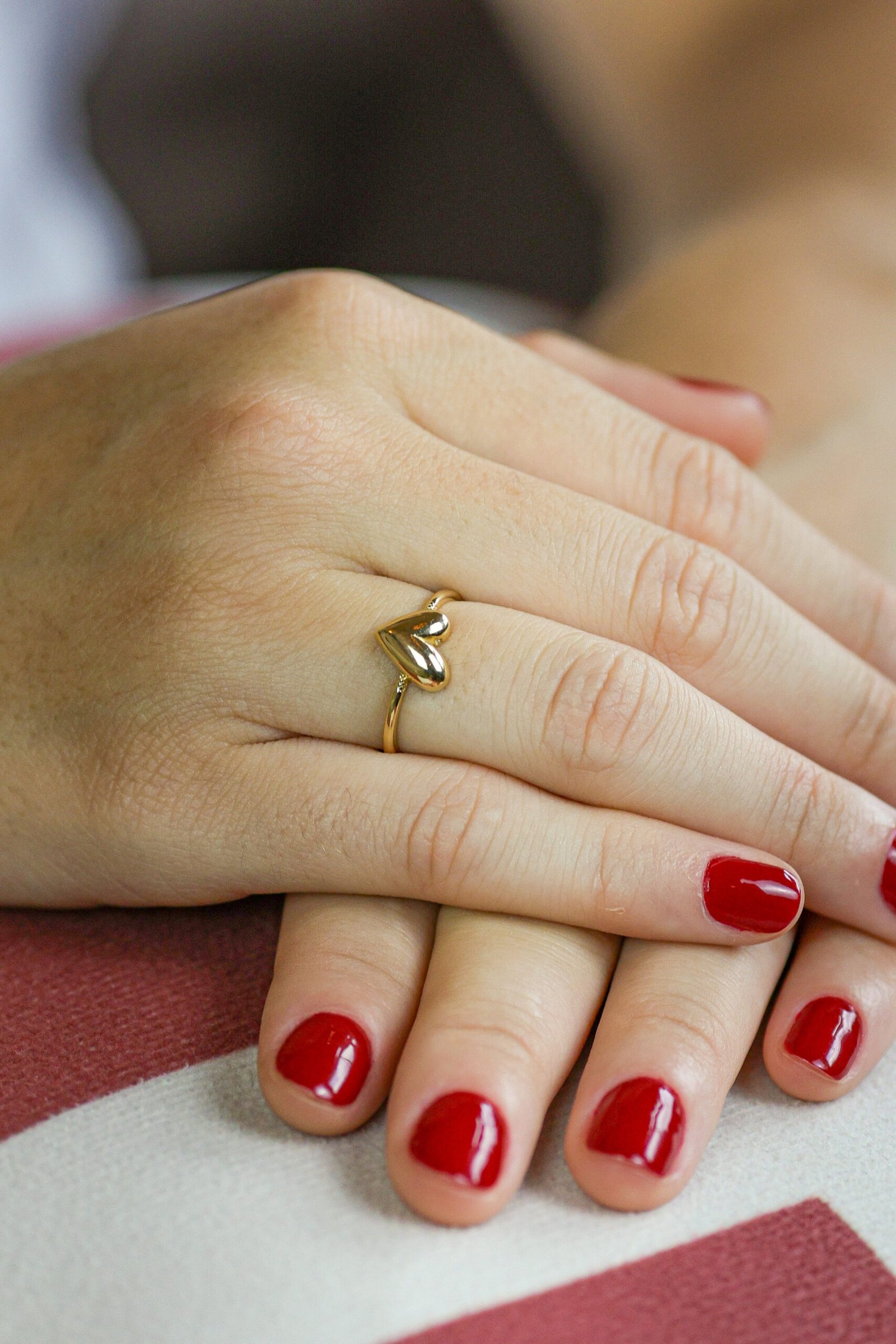 Anel delicado em formato de coração com acabamento liso e banho de ouro 18k.