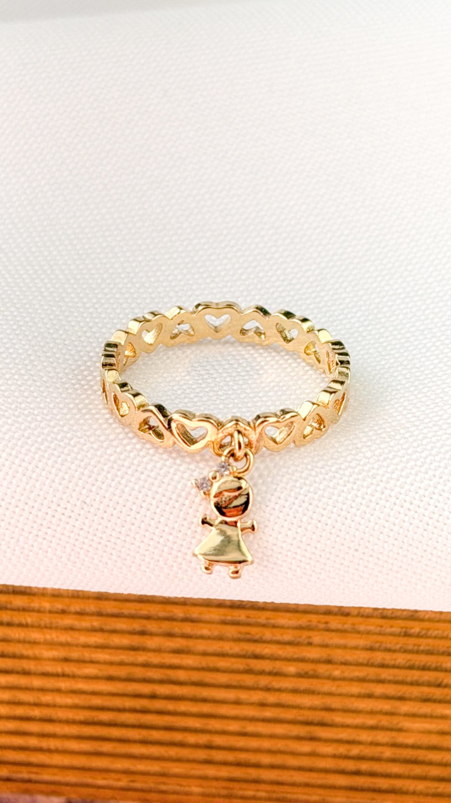 Anel em banho ouro 18k com corações vazados e pingente em formato de menina.