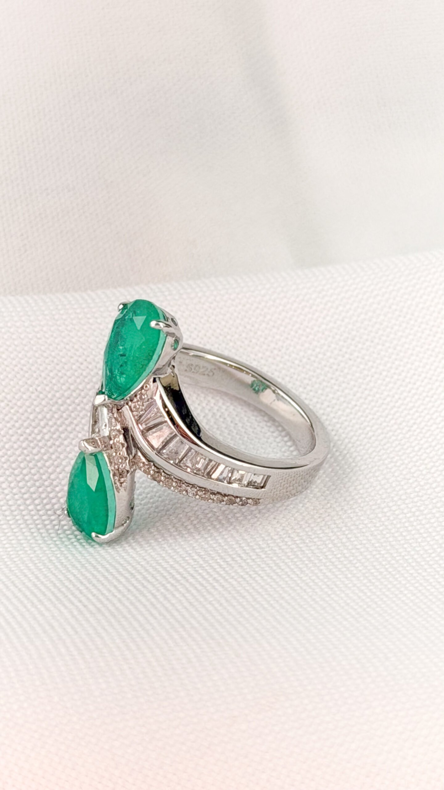 ANEL EM PRATA COM DESIGN CRUZADO, COMPOSTO POR DUAS PEDRAS VERDES EM FORMATO GOTA E ZIRCÔNIAS CRAVEJADAS NO CORPO. MODELO SOFISTICADO, COM ACABAMENTO POLIDO, IDEAL PARA QUEM BUSCA UMA PEÇA DE DESTAQUE COM ELEGÂNCIA. TAMANHO N15.