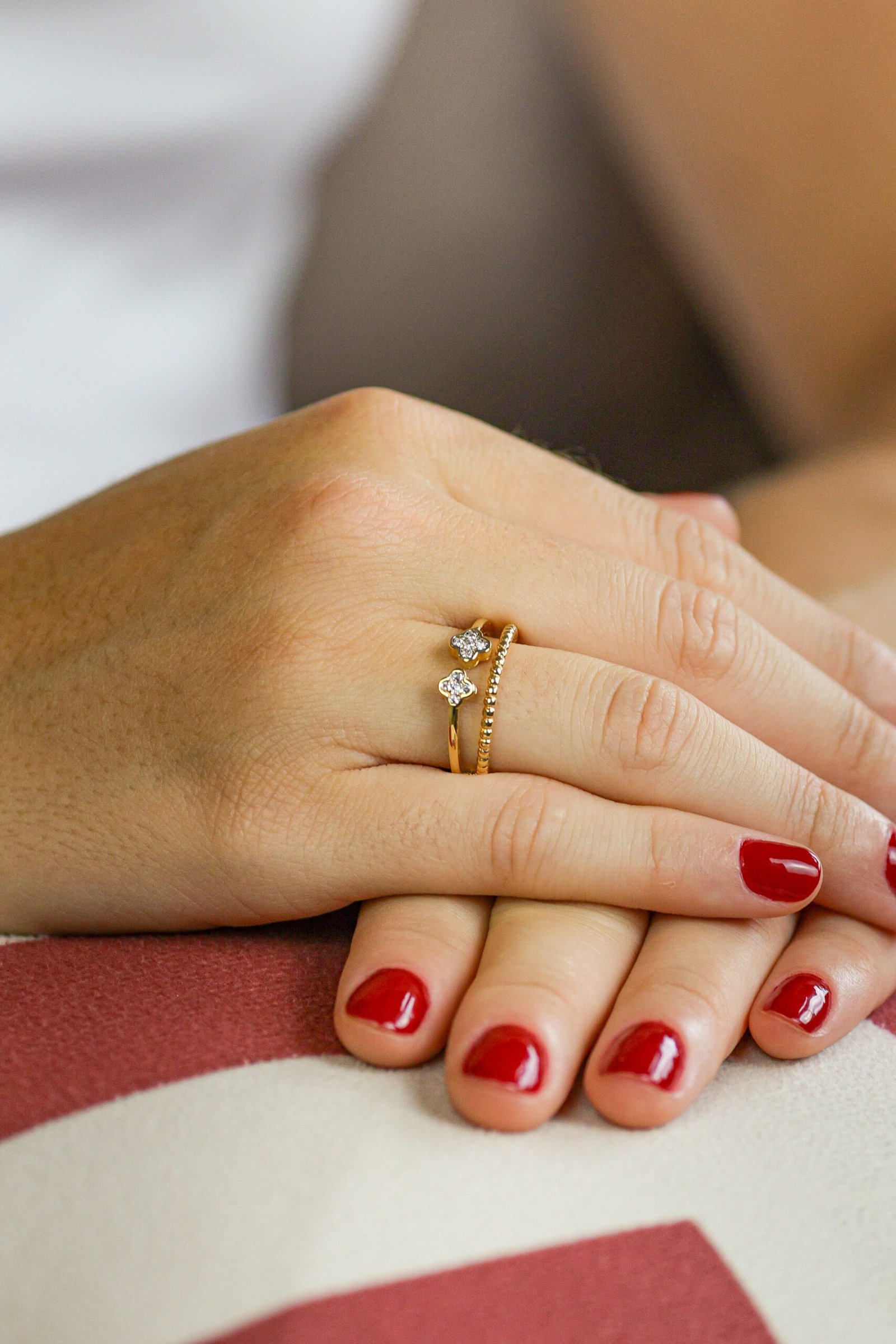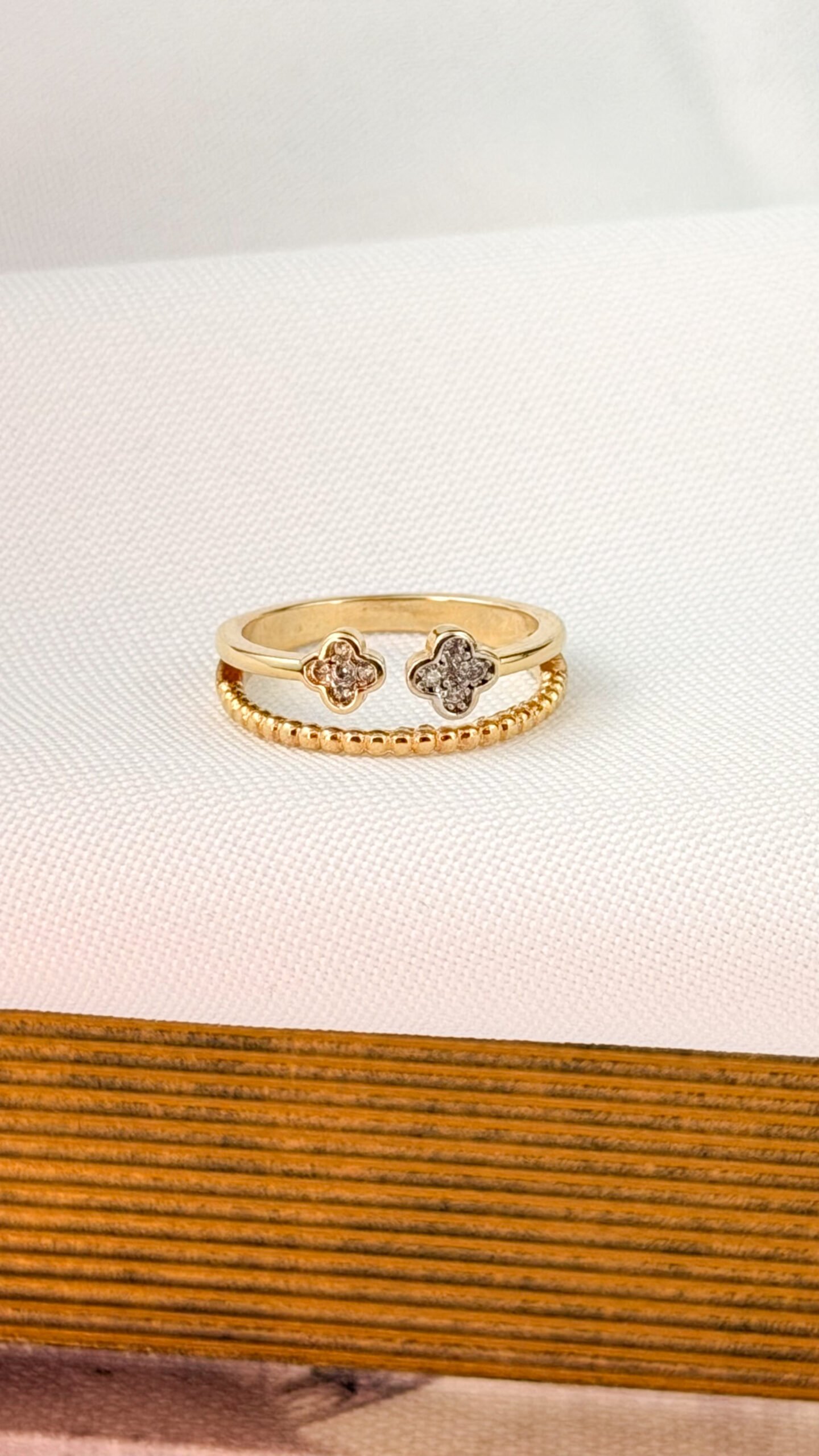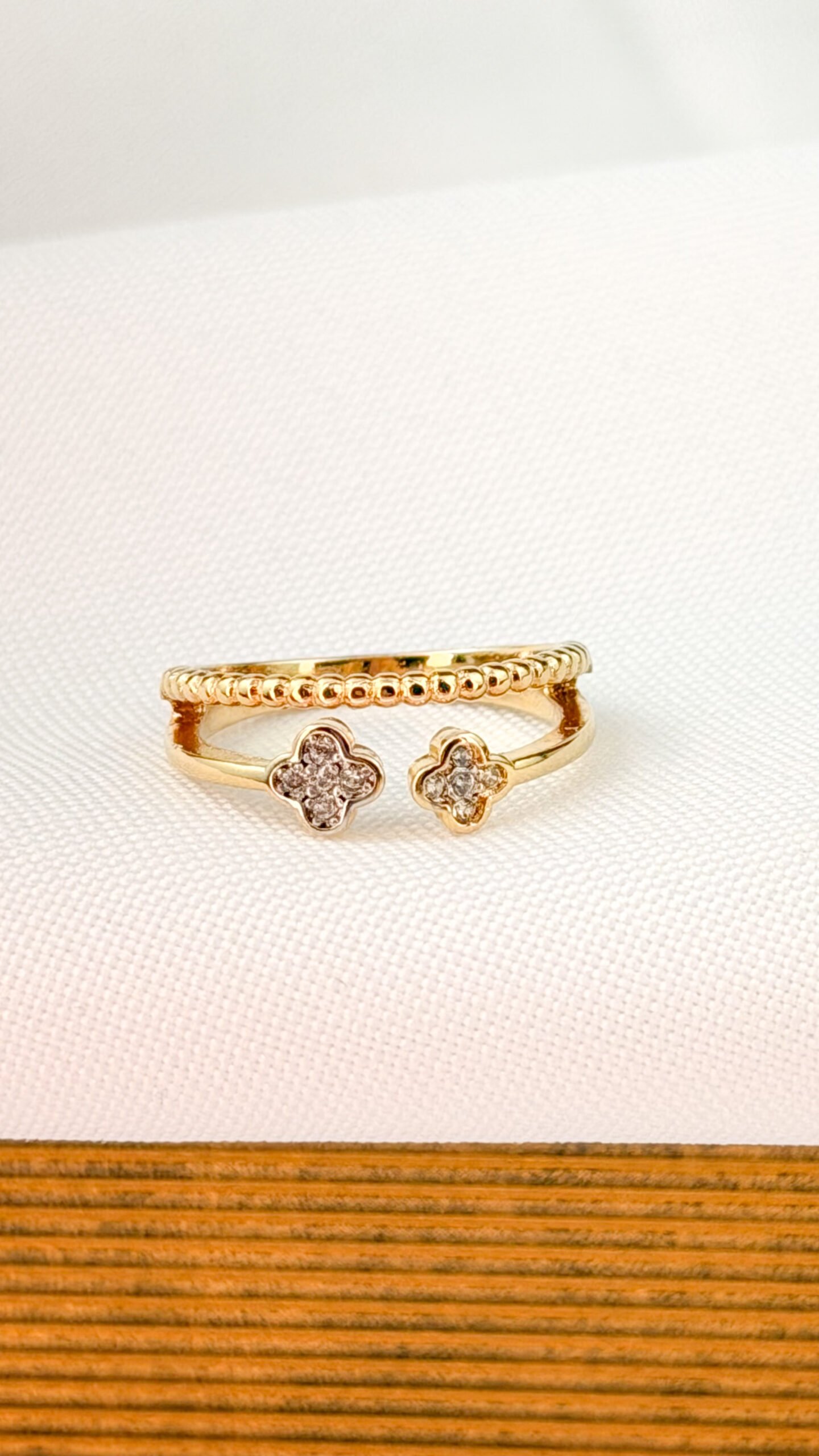 Anel em banho ouro 18k com detalhe central em formato trevo cravejado com zircônias, trazendo brilho sutil e acabamento elegante. Um modelo delicado e feminino, ideal para uso diário ou composições leves e sofisticadas. Tamanho 16. Peça hipoalergênica, proporcionando mais segurança para a pele.