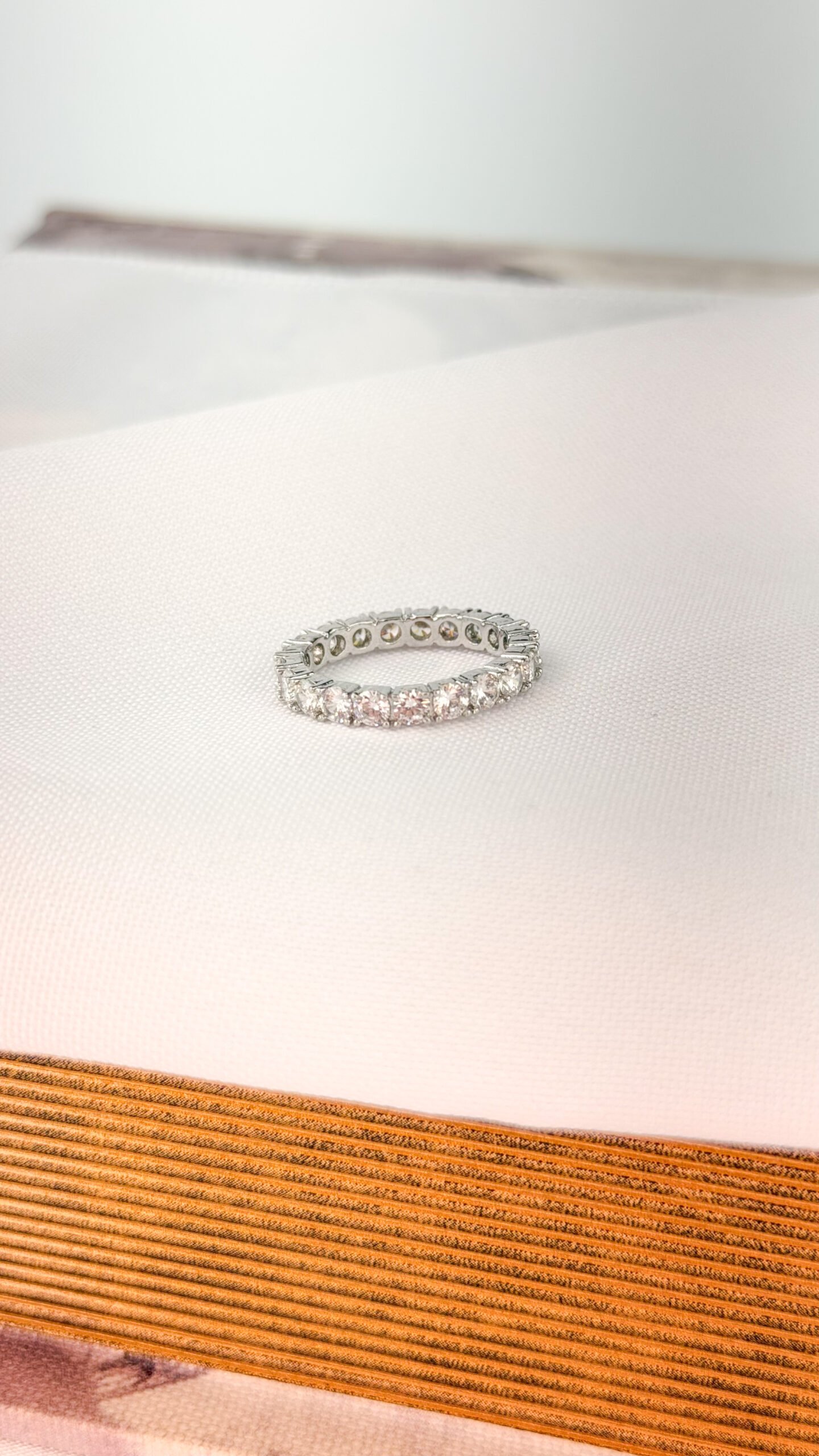 Anel em ródio branco inteiramente cravejado com zircônias, proporcionando brilho intenso e acabamento sofisticado em toda a peça. Um modelo elegante e atemporal, ideal para quem busca destaque com delicadeza. Pode ser usado sozinho como peça principal ou combinado com outros anéis para composições modernas e refinadas. Tamanho 15. Peça hipoalergênica, proporcionando mais segurança para a pele.