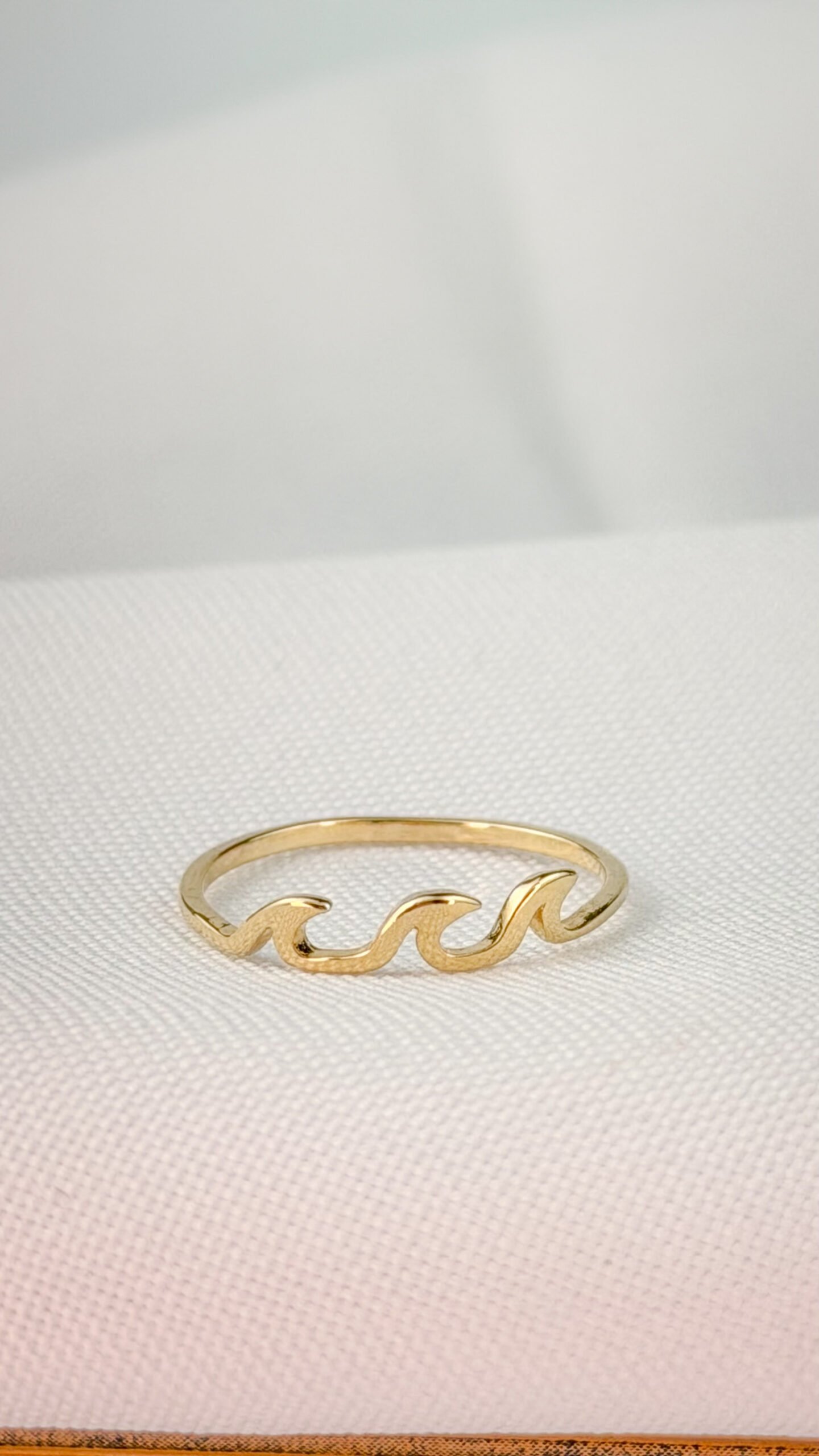 Anel em banho ouro 18k com design inspirado em ondas, apresentando linhas suaves e movimento elegante. Um modelo moderno e minimalista que transmite leveza e sofisticação, perfeito para quem aprecia joias versáteis e atemporais. Pode ser usado sozinho para um visual clean ou combinado com outros anéis para composições cheias de estilo. Tamanho 16. Peça hipoalergênica, proporcionando mais segurança para a pele.