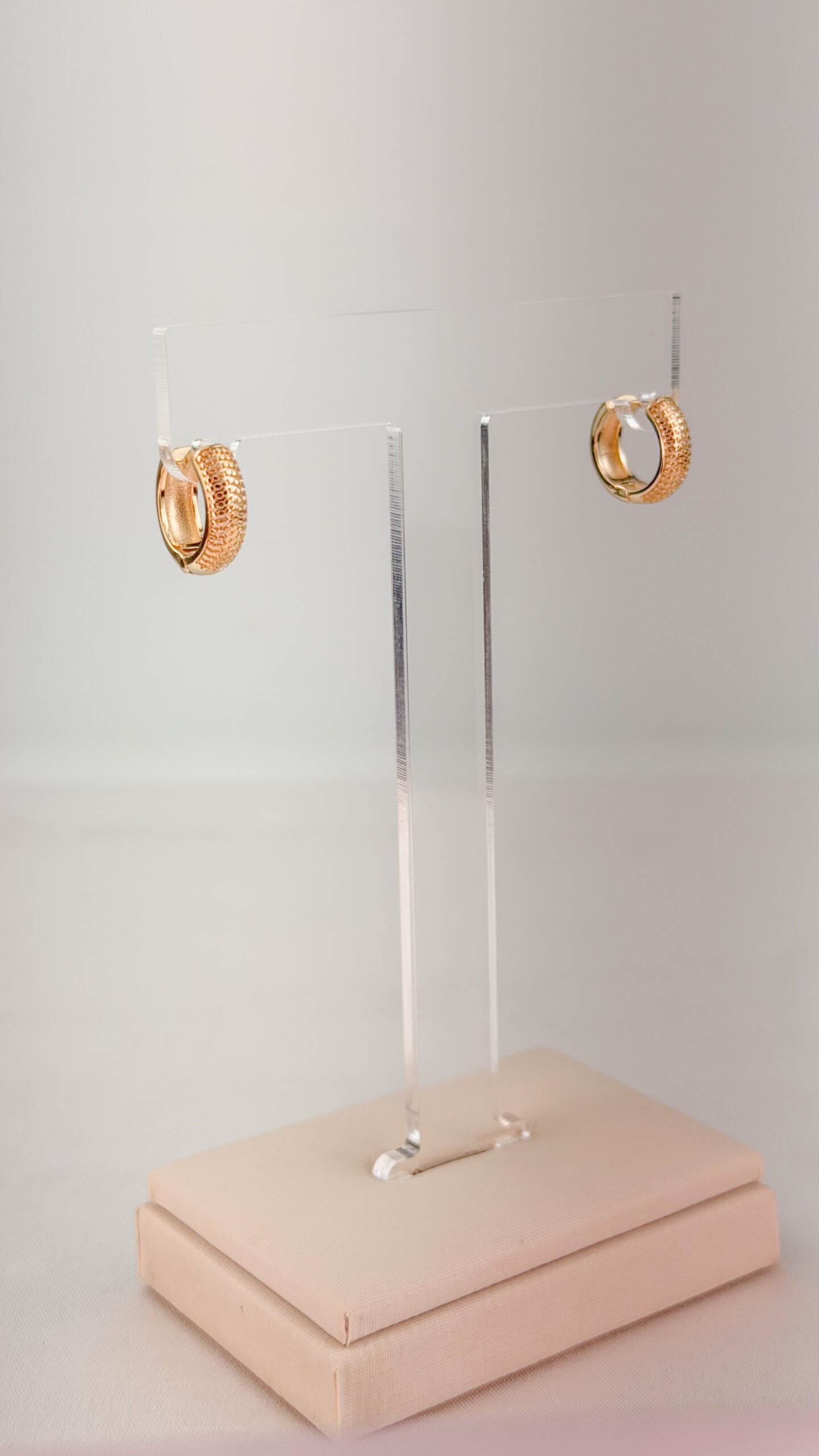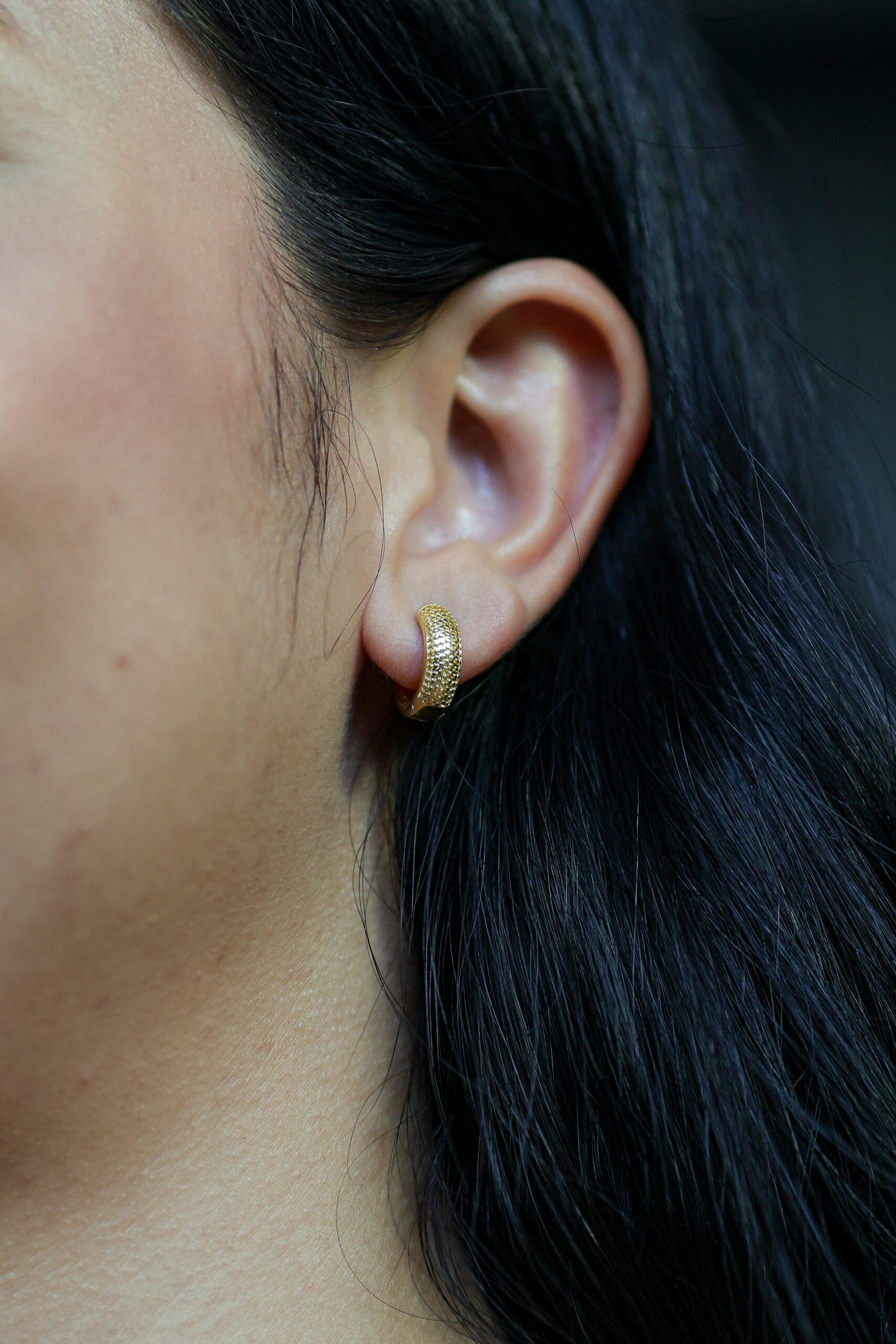 Argola click com banho ouro 18k, acabamento texturizado em relevo que valoriza o brilho da peça. Modelo de fechamento click, confortável e seguro, ideal para uso diário ou composições elegantes. Peça hipoalergênica, proporcionando mais segurança para a pele.