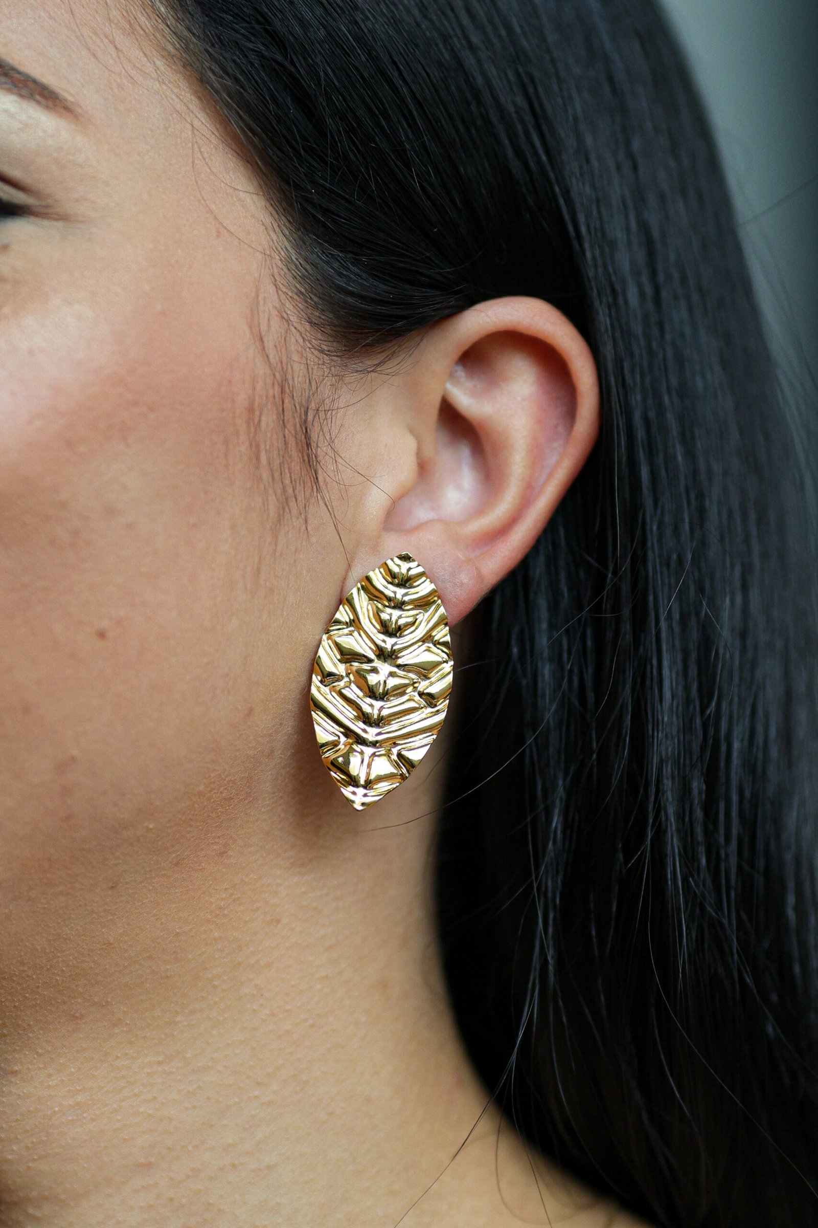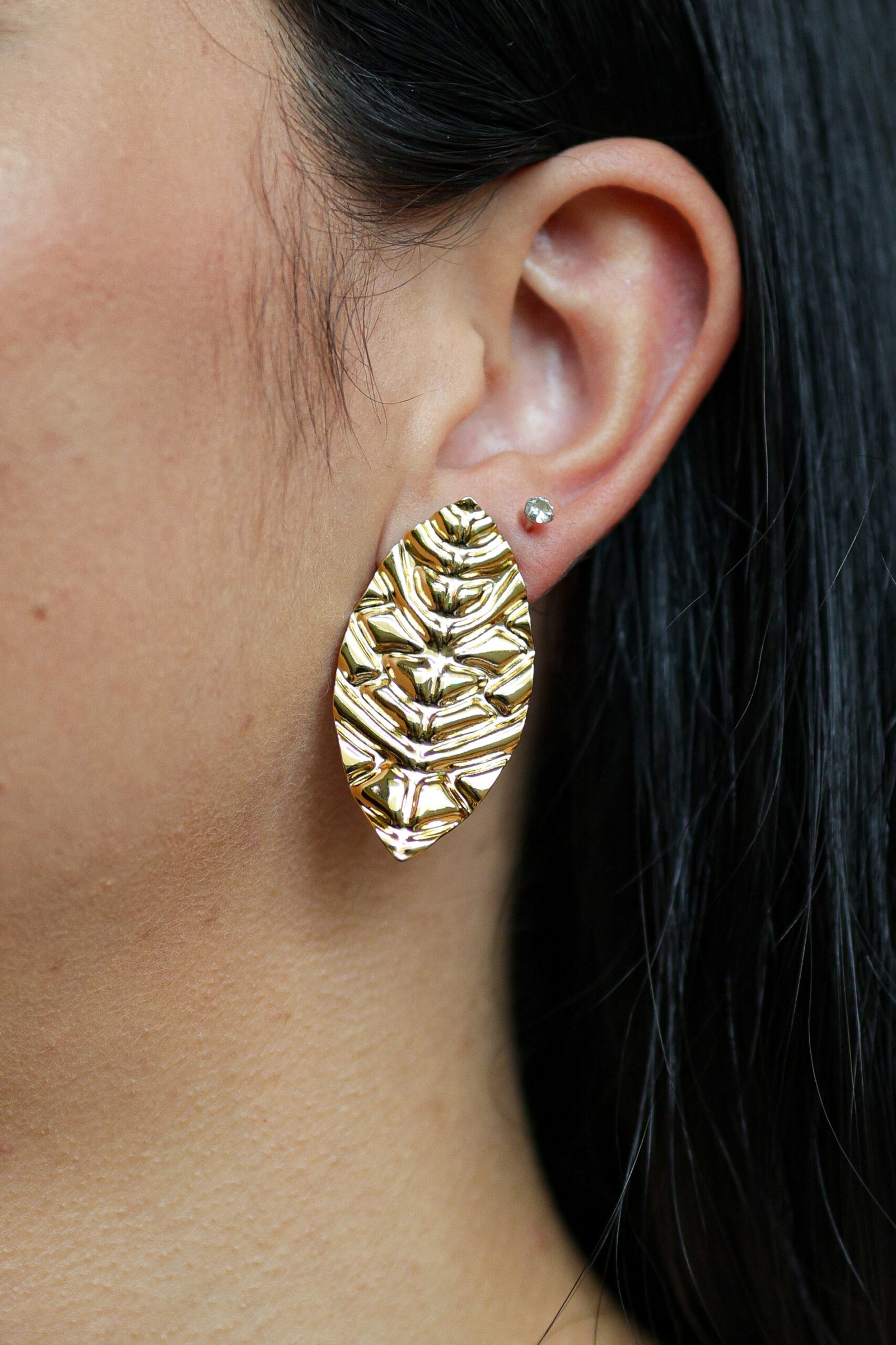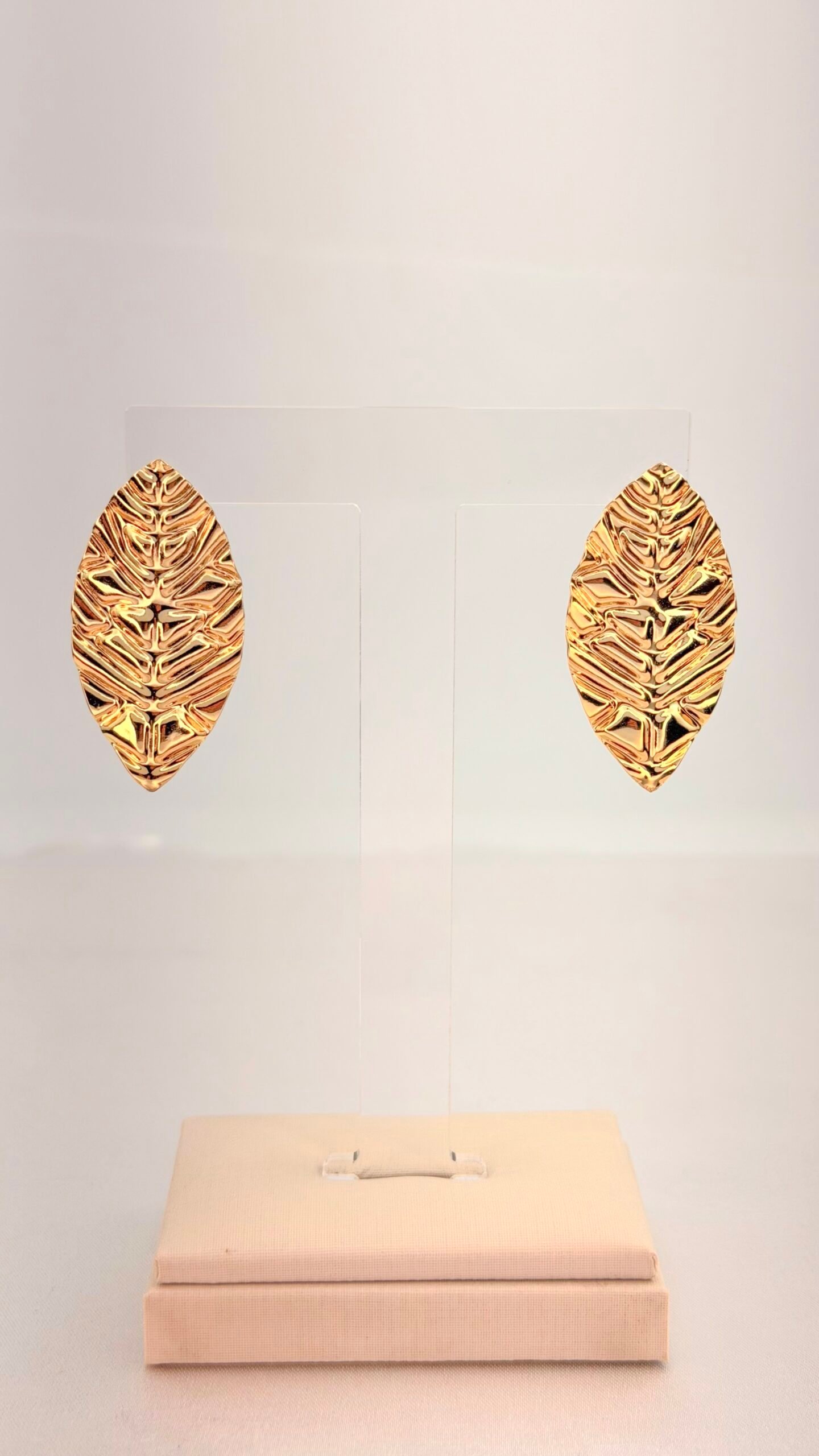 Brinco em formato de folha com design orgânico e superfície texturizada, banho ouro 18k, acabamento polido e fecho por tarraxa. Peça elegante e marcante, ideal para compor produções modernas com sofisticação. Peça hipoalergênica, proporcionando mais segurança para a pele.