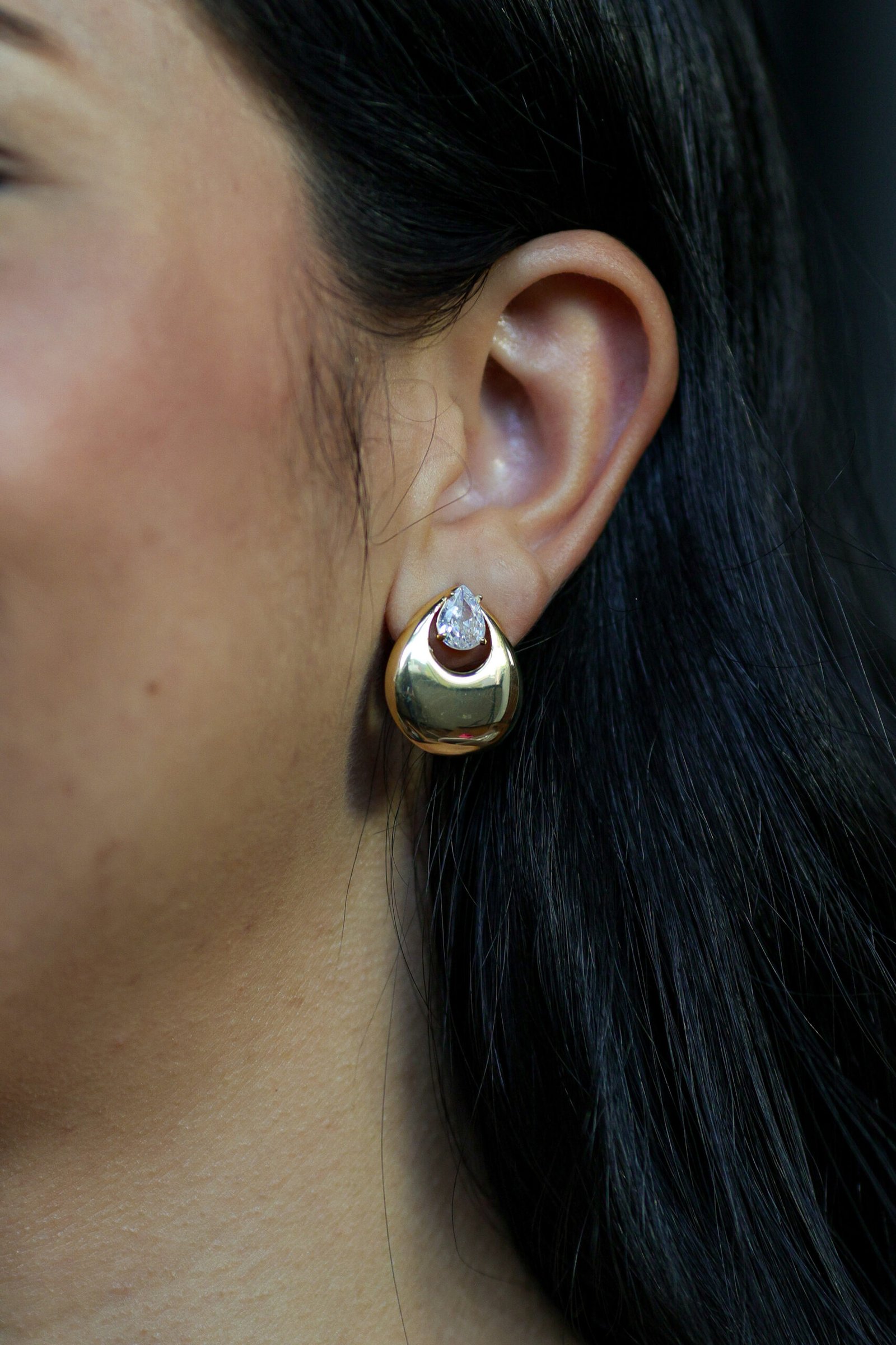 Brinco formato gota com design liso e zircônia em destaque, trazendo sofisticação ao visual. Possui banho em ouro 18k e acabamento polido que garante brilho e elegância. Ideal para composições refinadas do dia à noite. Peça hipoalergênica, proporcionando mais segurança para a pele.
