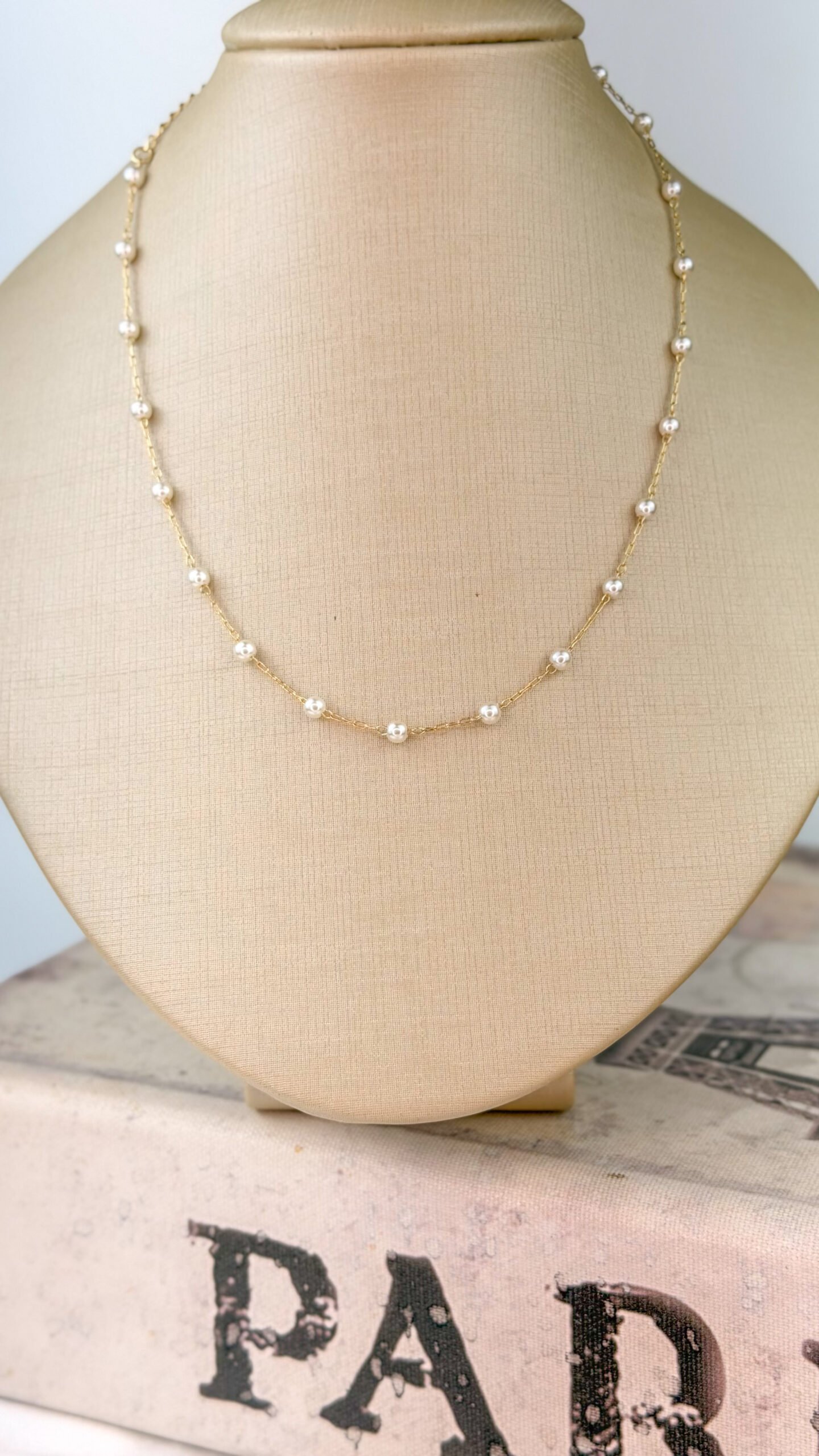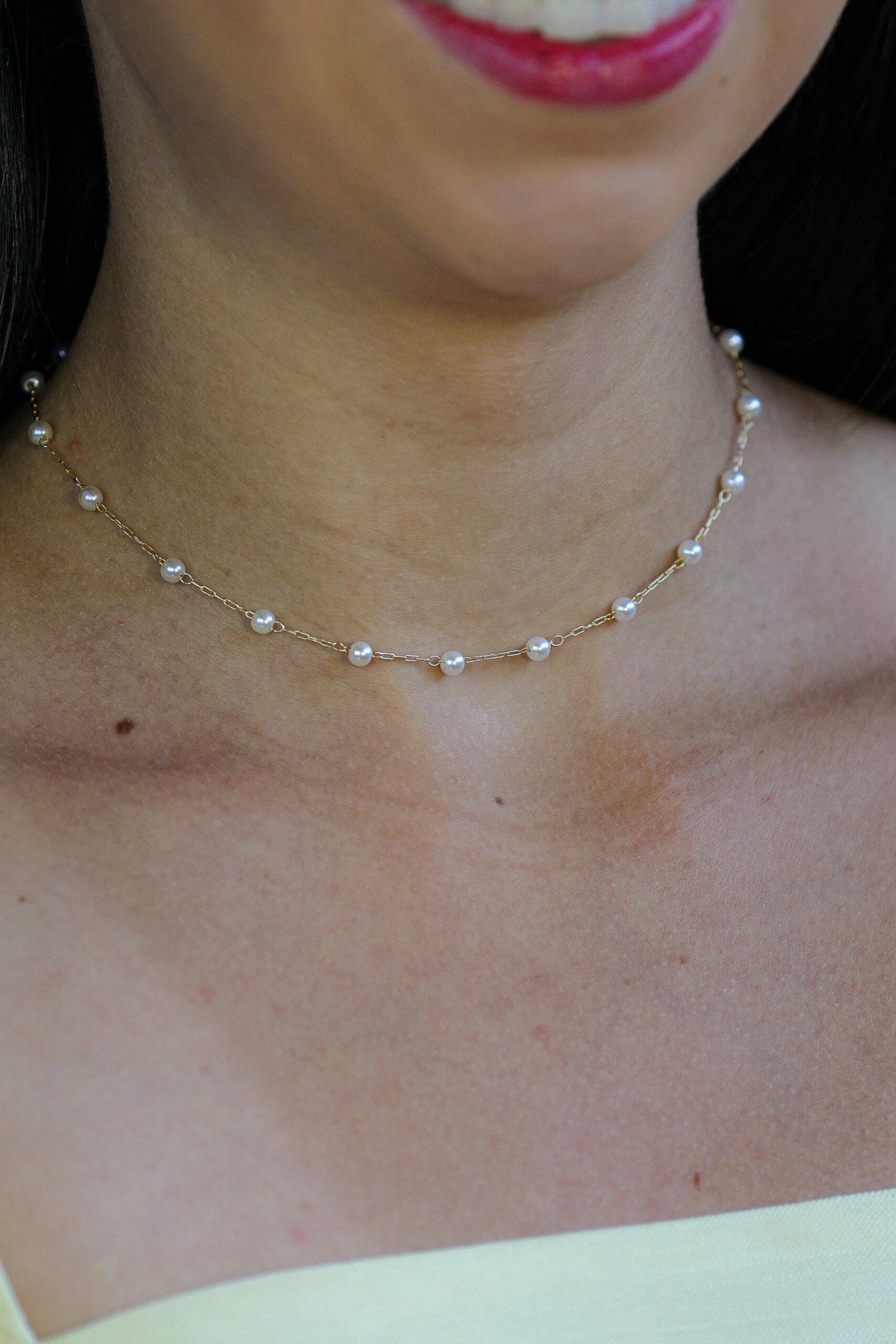 Choker com pérolas delicadas intercaladas por corrente fina, com banho ouro 18k e fechamento ajustável por extensor. Uma peça atemporal que traz leveza, elegância e sofisticação para qualquer produção Peça hipoalergênica, proporcionando mais segurança para a pele.