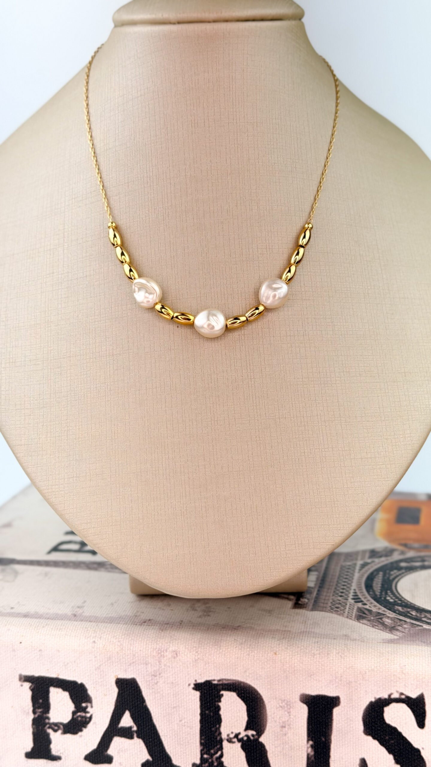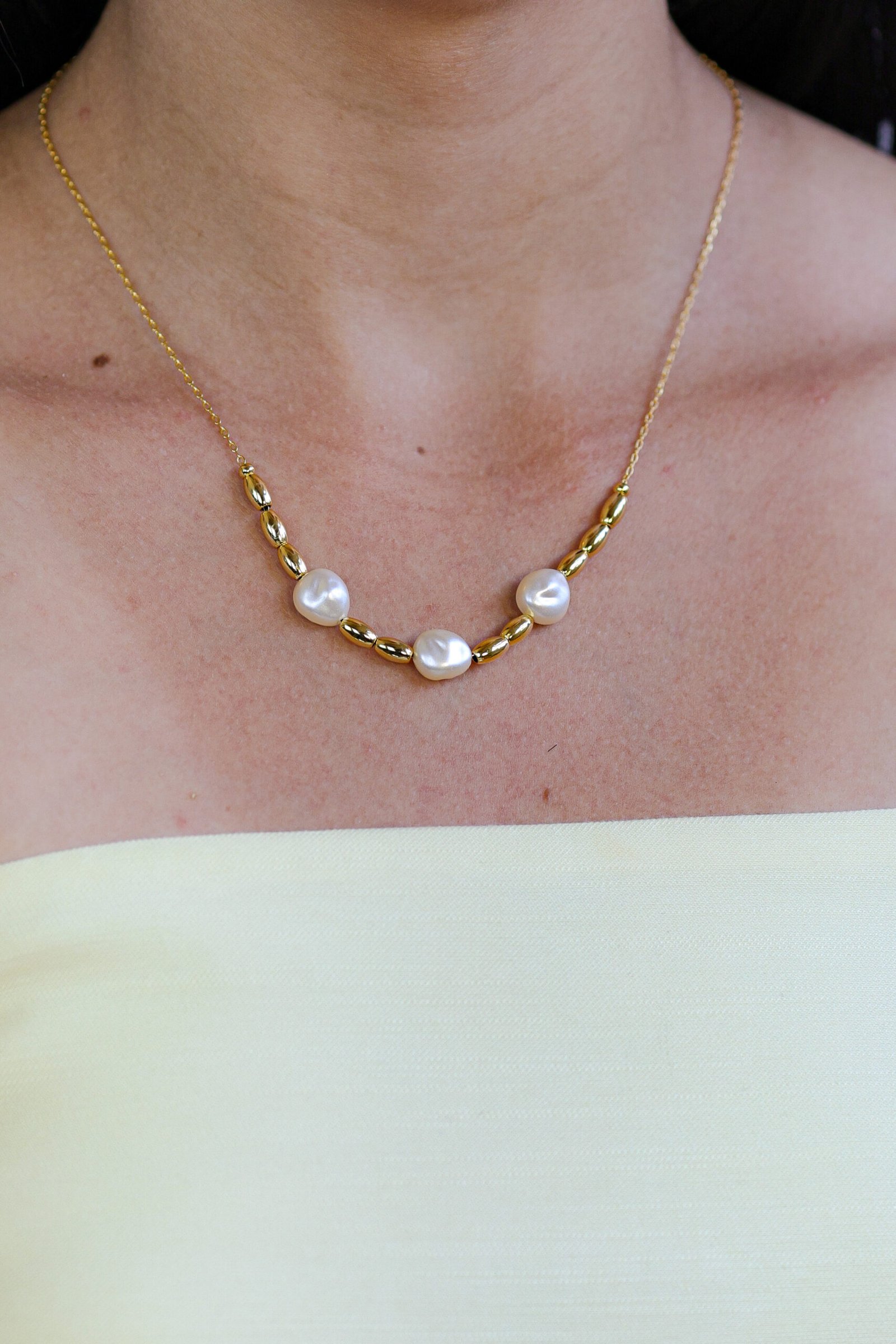 Colar elegante com pérolas orgânicas intercaladas por elos, acabamento sofisticado em banho ouro 18k.