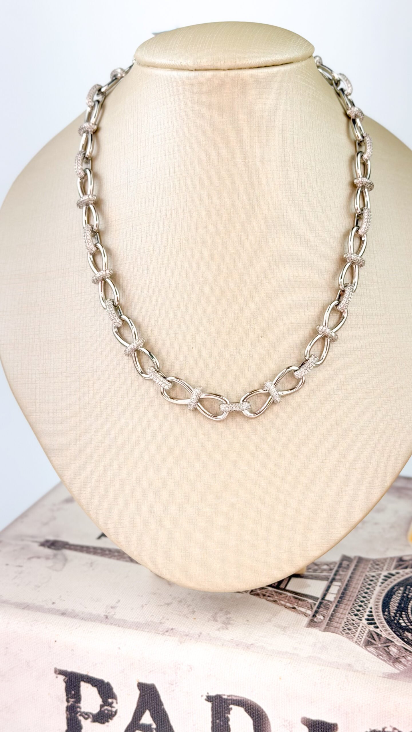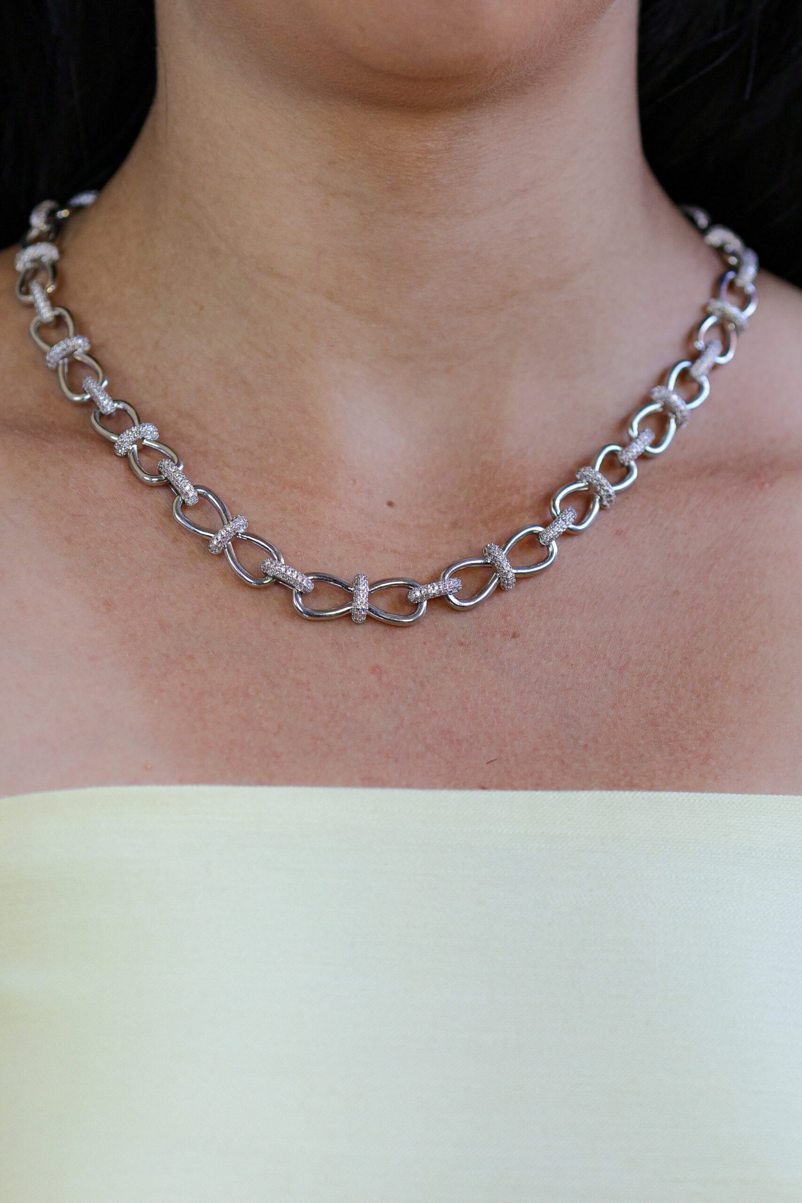 Colar em banho ouro 18k composto por elos interligados com detalhes delicadamente cravejados em zircônias, criando um visual marcante e sofisticado. Uma peça elegante que pode ser usada sozinha comodestaque do look ou combinada com colares mais finos para uma produção moderna e estilosa, ideal para ocasiões especiais ou para elevar produções do dia a dia. Comprimento de 45 cm. Peça hipoalergênica, proporcionando mais segurança para a pele.
