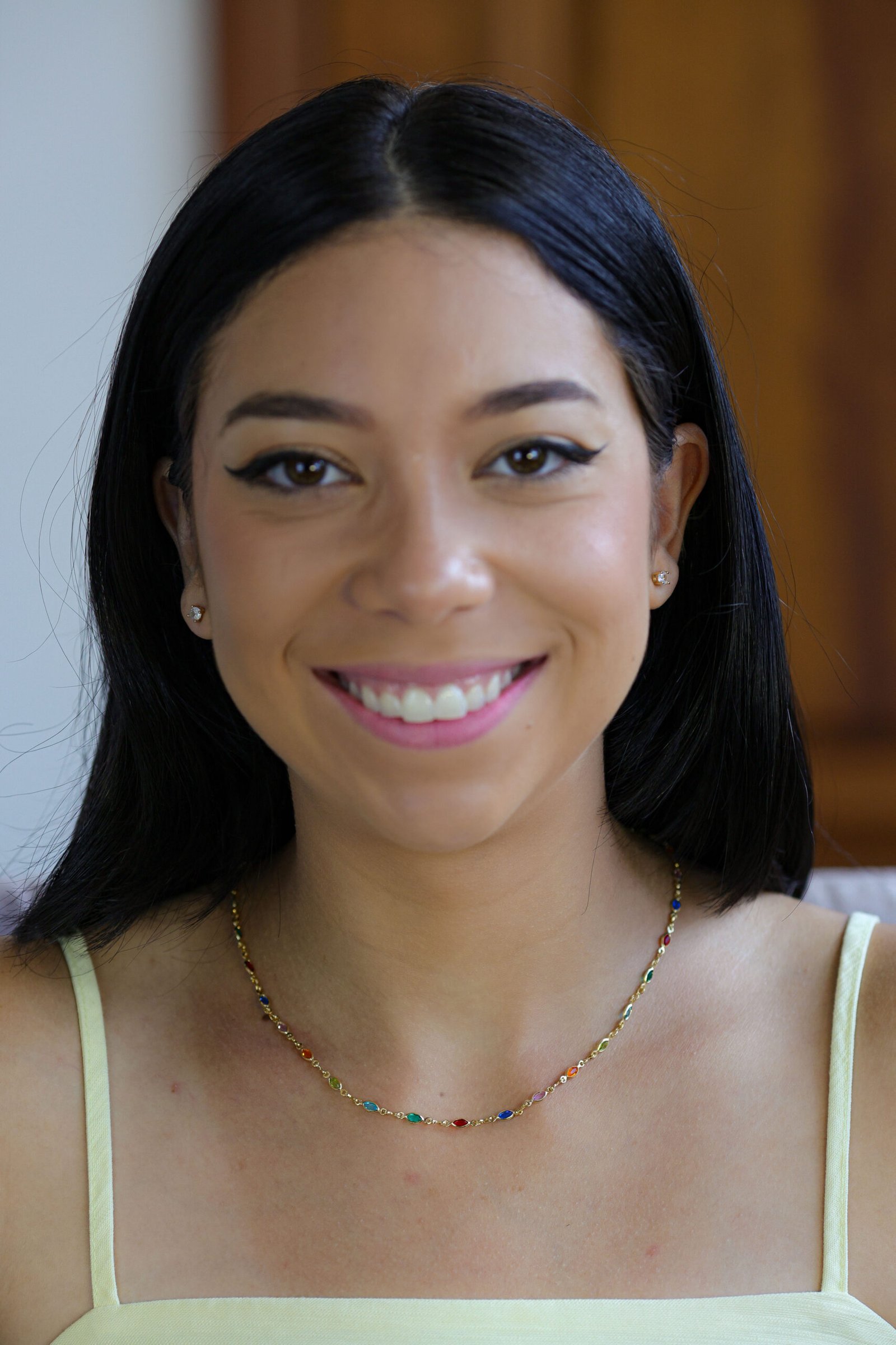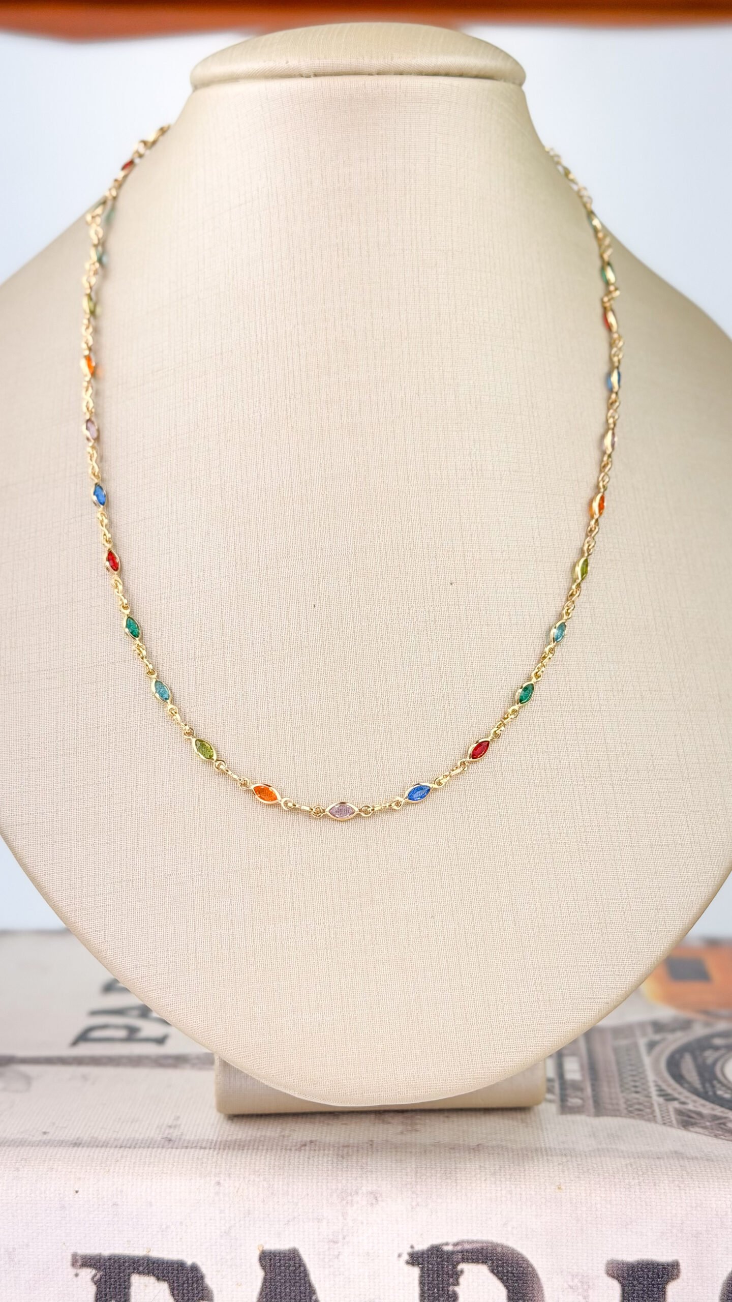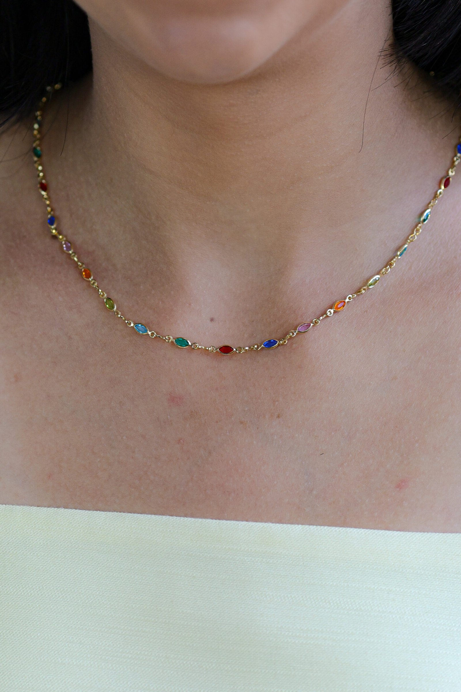 Colar em banho ouro 18k com pedras multicoloridas em formato geométrico, distribuídas ao longo da corrente. Possui comprimento de 45 cm, sem extensor, perfeito para uso individual ou em mix de colares. Peça hipoalergênica, proporcionando mais segurança para a pele.
