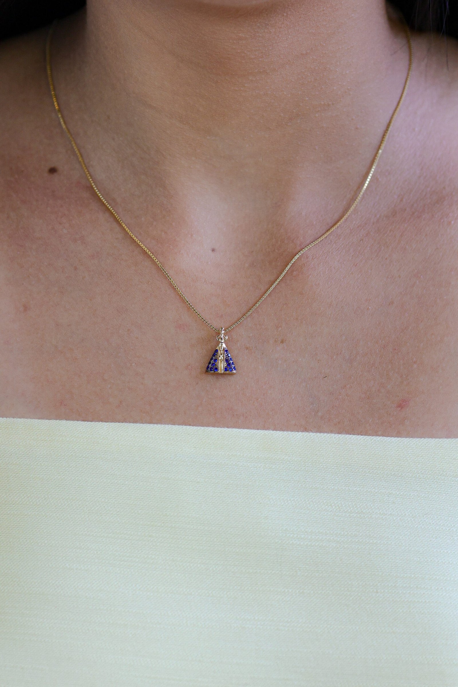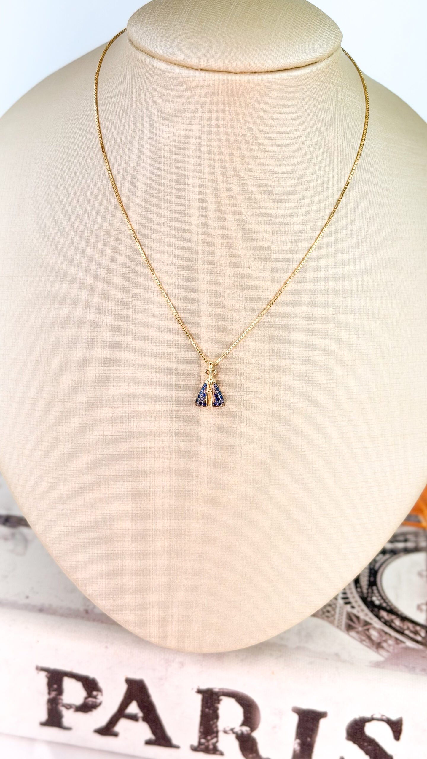 Colar delicado com corrente de 45 cm e extensor, confeccionado em semijoia com banho dourado, trazendo pingente de Nossa Senhora Aparecida com detalhes cravejados em pedras azuis que realçam o brilho e a sofisticação da peça. Ideal para quem busca um acessório elegante com significado de fé, proteção e devoção, perfeito para uso diário ou para presentear alguém especial. ✨🙏 Peça hipoalergênica, proporcionando mais segurança para a pele.