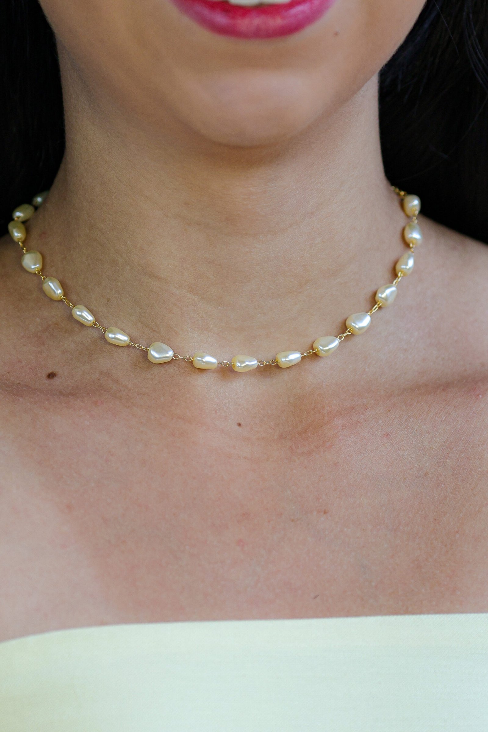 Colar com pérolas orgânicas em design irregular, interligadas por corrente com banho ouro 18k. Possui comprimento de 40 cm com extensor, proporcionando ajuste perfeito ao colo. Uma peça sofisticada e versátil, ideal para uso diário ou para composições mais elegantes. Peça hipoalergênica, proporcionando mais segurança para a pele.