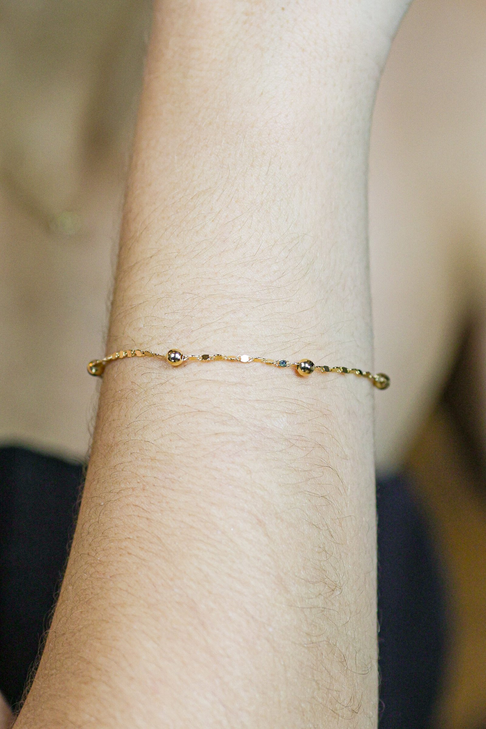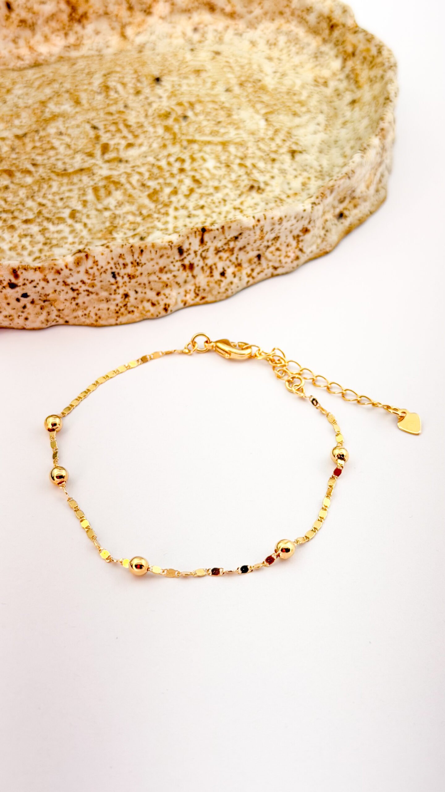 Pulseira confeccionada em corrente fina com bolinhas espaçadas que trazem leveza ao design, acabamento em banho ouro 18k, extensor regulável e fecho tradicional. Peça elegante e sutil, ideal para quem busca um acessório discreto com brilho suave para composições refinadas ou uso em sobreposição. Peça hipoalergênica, proporcionando mais segurança para a pele.