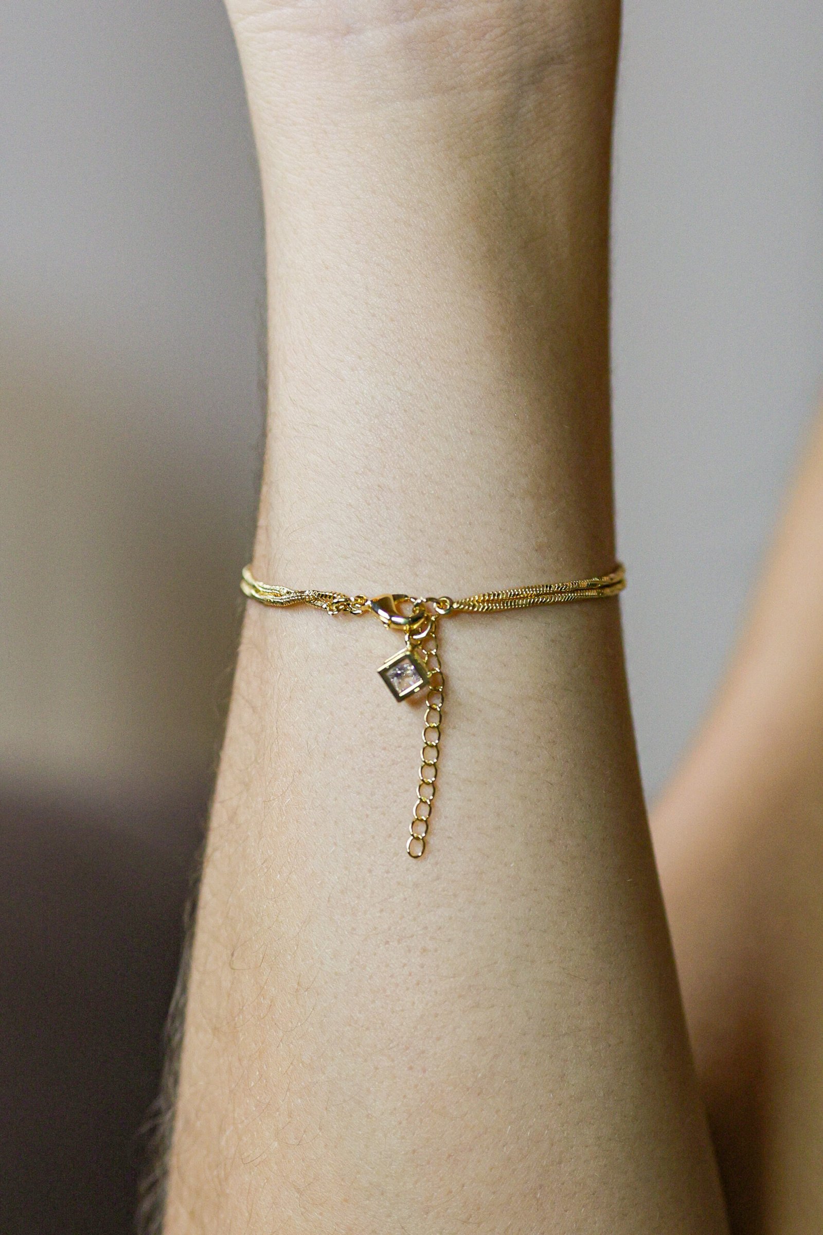 Pulseira dupla em malha veneziana, com banho ouro 18k, formada por duas correntes delicadas que valorizam o pulso com elegância. Possui pingente em formato de dado cravejado em zircônias, trazendo brilho sutil e um toque moderno à composição. Peça versátil, ideal para uso individual ou em mix de pulseiras. Peça hipoalergênica, proporcionando mais segurança para a pele.
