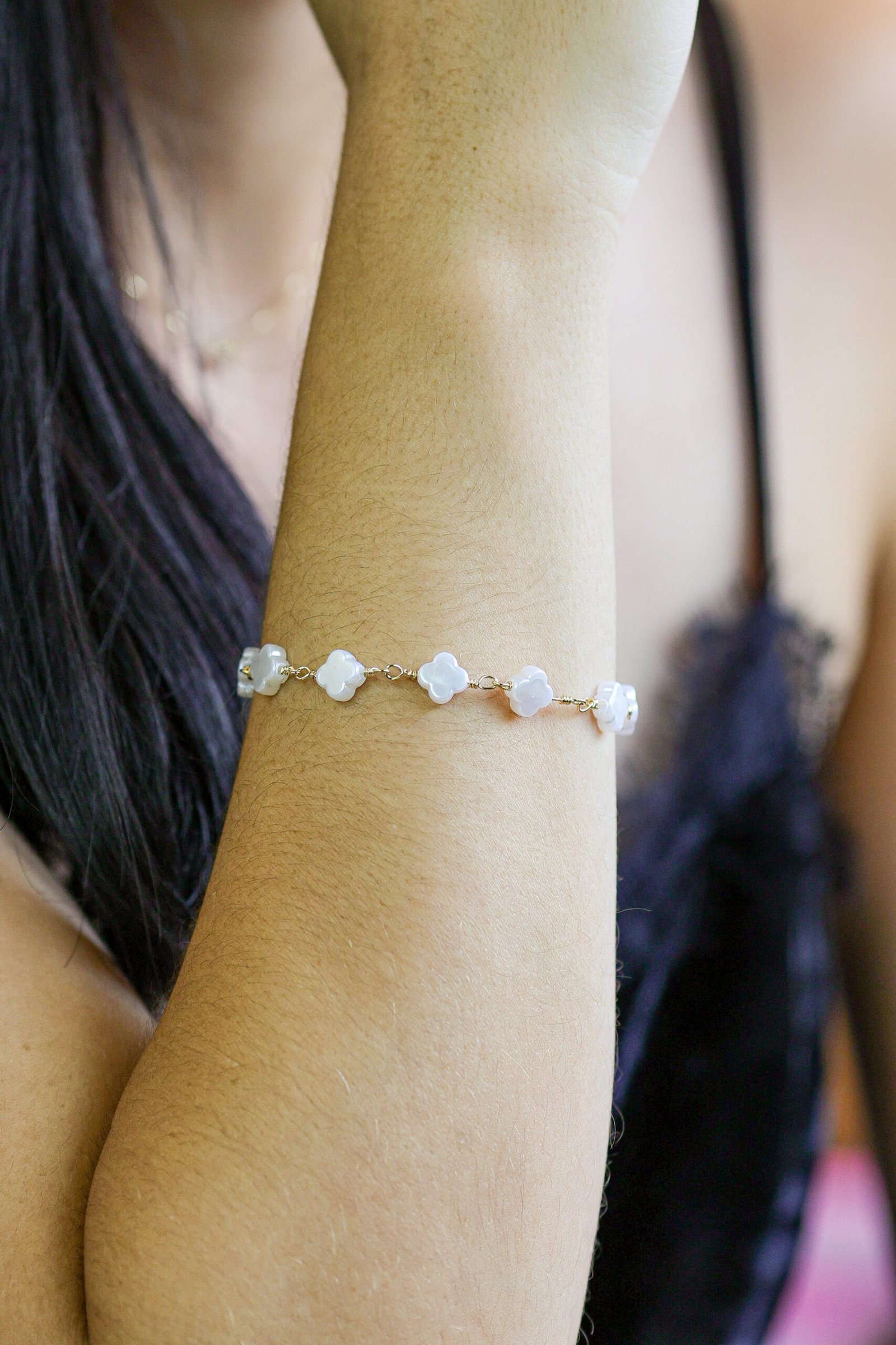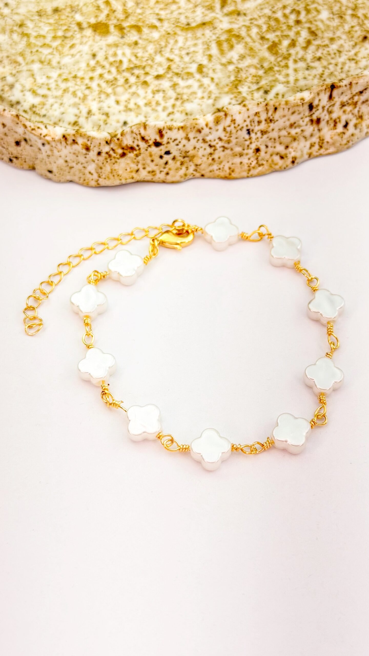Pulseira em banho ouro 18k, composta por trevos em madrepérola que trazem elegância e simbologia de sorte à peça. Possui design delicado e atemporal, ideal para uso diário ou para composições sofisticadas. Fecho lagosta que garante praticidade e segurança no uso. Peça hipoalergênica, proporcionando mais segurança para a pele.