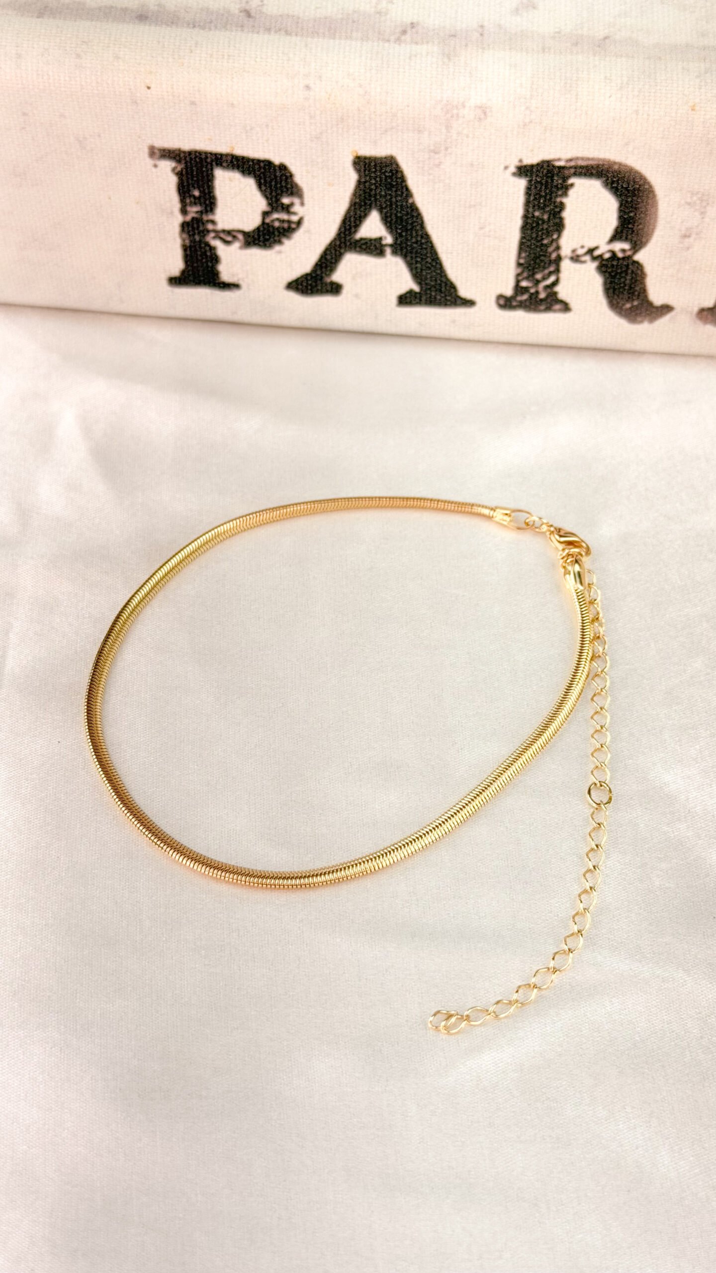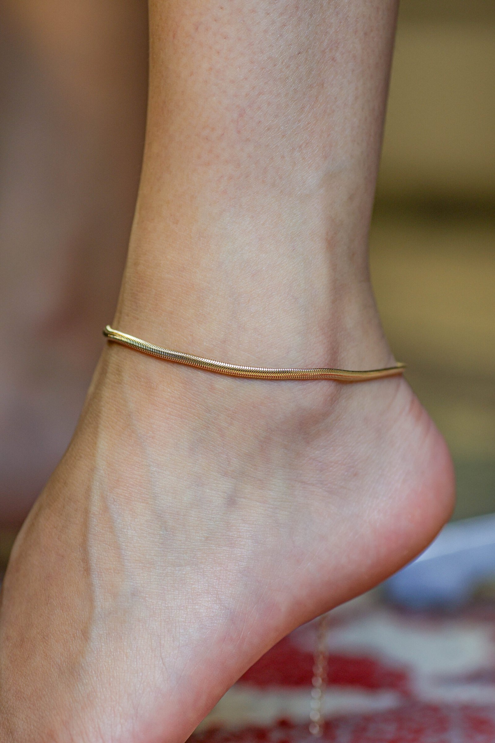 Tornozeleira em banho de ouro 18k com malha snake elegante e brilho sofisticado.